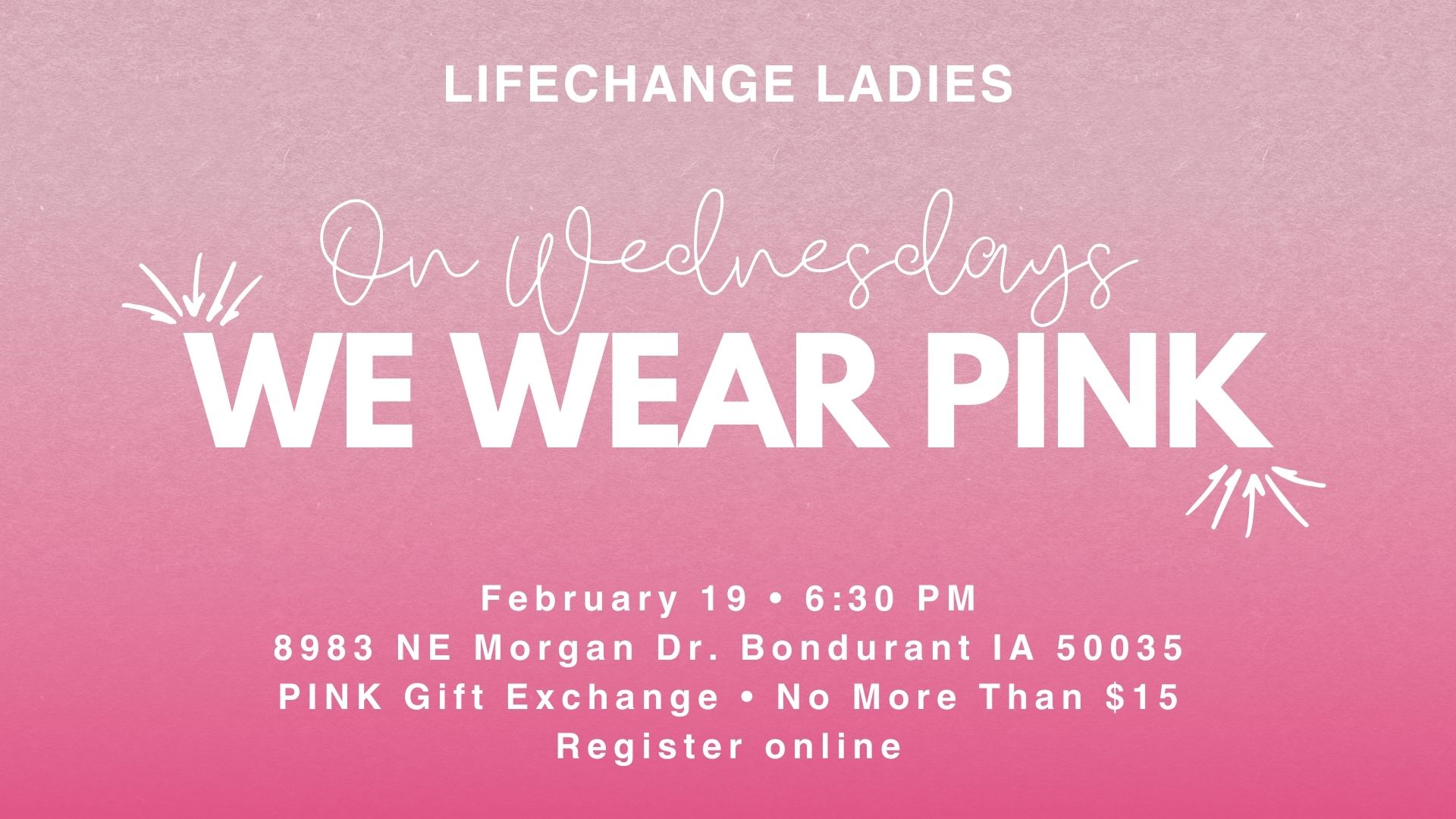 Details *Ladies Only* Come for an evening of PINK, food, and community! When: February 19th, Thursday, 6:30 PM Where: 8983 NE Morgan Dr. Bondurant IA 50035 Register: https://lifechangedsm.churchcenter.com/registrations/events/3441582 Gift Exchange...